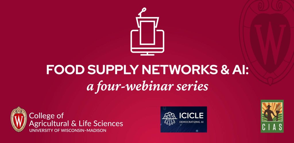 This webinar series is made possible by the ICICLE – Intelligent CI with Computational Learning in the Environment -U.S. National Science Foundation AI Center under OAC-2112606 and organized by the UW-CALS Center for Integrated Agricultural Systems, with support from several UW partners: the Grainger Center for Supply Chain Management, theKaufman Lab, Center for Sustainability and the Global Environment (SAGE), Organic Collaborative, Center for Cooperatives, and the Food Studies Network.