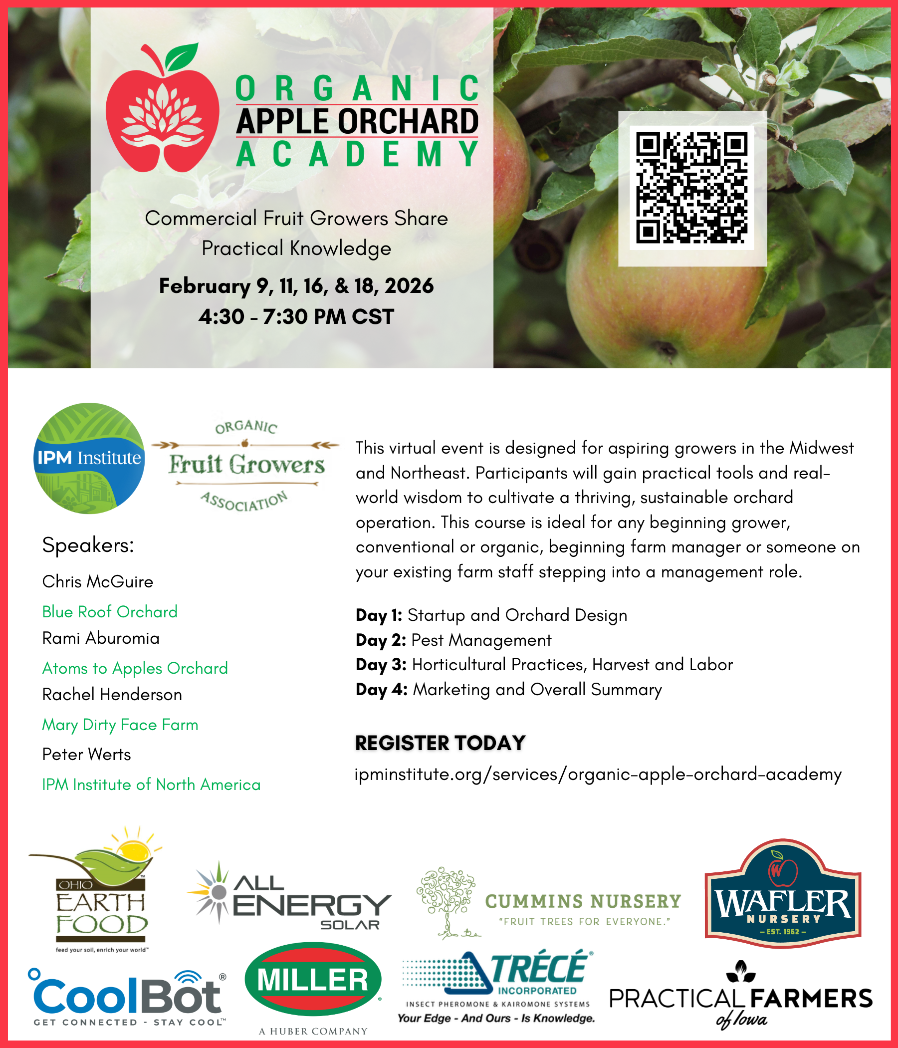 The Organic Apple Orchard Academy is a virtual event happening the evenings of February 9th, 11th, 16th and 18th, 2026 from 4:30-7:30 PM Central Time.