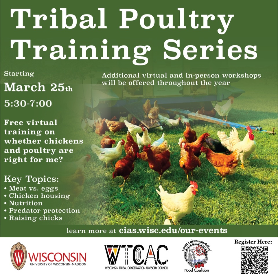 In partnership with Wisconsin Tribal Conservation Advisory Council and Great Lakes Intertribal Food Coalition, the University of Wisconsin-Madison is hosting a Tribal Poultry Training Series beginning with the basics virtually on March 25th before going into greater detail in subsequent virtual and in-person sessions.