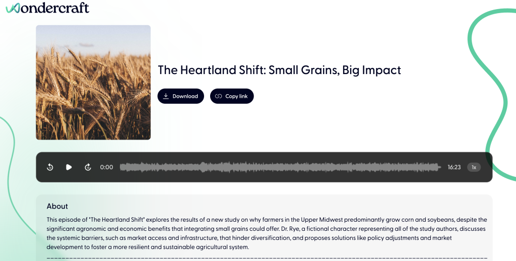 Check out our new AI voiced podcast “The Heartland Shift: Small Grains, Big Impact”! CIAS Food Systems Scientist Dr. Lauren Asprooth uses AI podcasting to highlight the results of a recent publication in the Journal of Soil and Water Conservation titled “Our daily bread in the Heartland: Understanding and leveraging diversification to small grains in corn and soybean systems”.